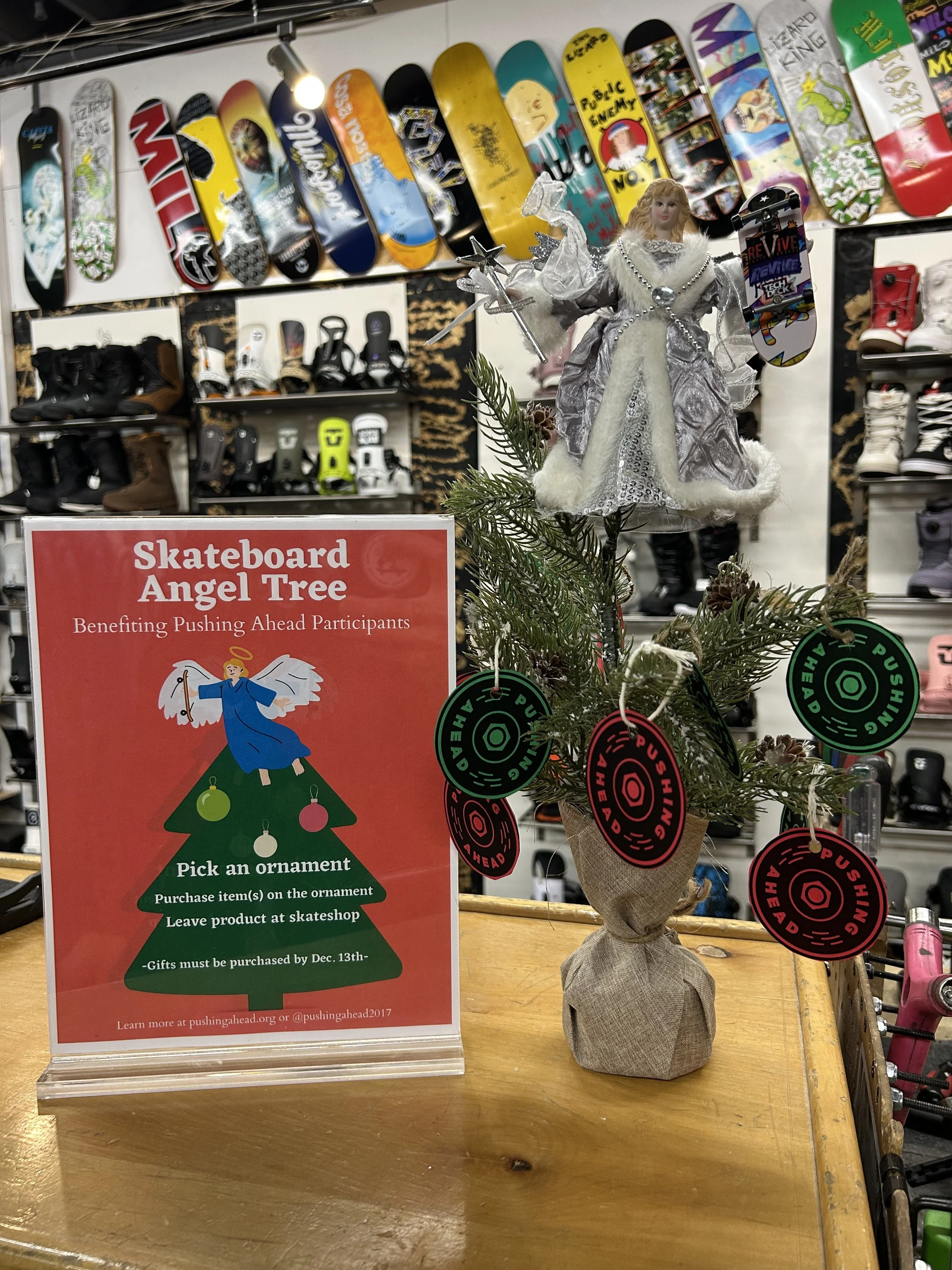 We think everyone wants skateboard gifts for Christmas! We love receiving skateboard gifts for Christmas and want to share that with others in need. The Skateboard Angel Tree is a way for Pushing Ahead’s past participants to request skateboard related gifts for Christmas. They are able to request two gifts. The gifts include one bigger ticket item ($50 or more) and one smaller ticket items (less than $50). We place Angel Tree’s at local shops and while shoppers participate in holiday shopping they can purchase gifts for individuals. On December 13th we collect them all and distribute the gifts to participants before Christmas.
